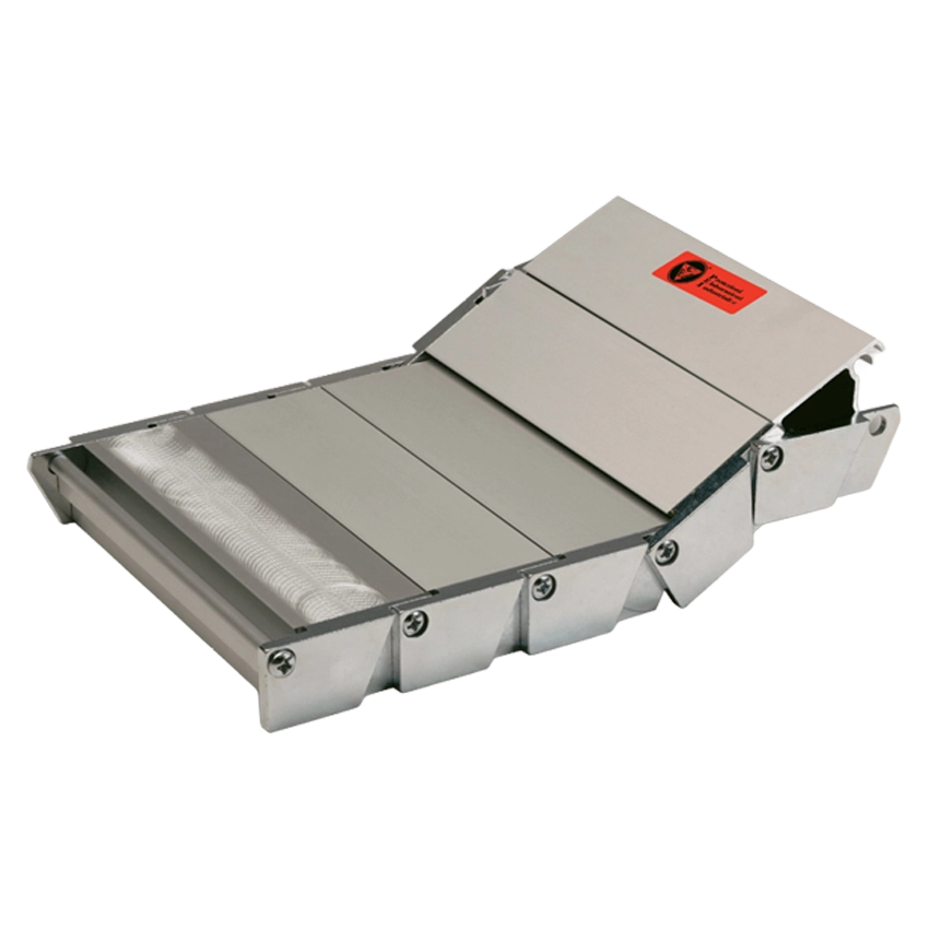 Na tomto obrázku je krycí systém SP-2R XY vybaven ocelovým krytem SHEET-POCKET™ na ose Y a dvěma roletami se speciální páskou Ceramix namontovanou na ose X.