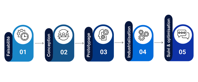 Notre approche s’appuie sur un processus clair et collaboratif, illustré ci-dessous, pour vous accompagner de l’idée à l’usage et sécuriser chaque étape de votre développement :